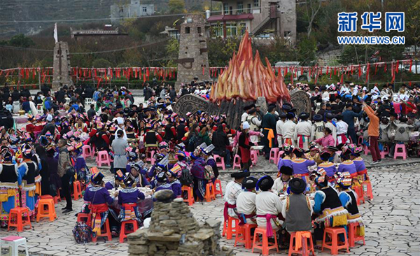 Thousands of Qiang people have dinner together, celebrating the New Year Festival on Nov 18, 2017. [Photo/Xinhua]