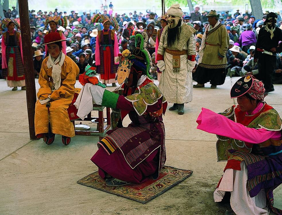 Tibetan opera, the most popular traditional opera of minority ethnic groups in China, is a comprehensive art combining folk song, dance, storytelling, chant, acrobatics and religious performance. Most popular in the Qinghai-Tibetan Plateau in western China, the performance begins with a prayer ceremony, including the cleansing of the stage by hunters and blessings by the elder, and concludes with another blessing. The heart of the opera is a drama narrated by a single speaker and enacted by performers supported by groups of singers, dancers and acrobats. Actors wear traditional masks of a variety of shapes and colours that contrast with their simple makeup. Performances may take place in public squares or temples (or, today, on stage), with the centre of the space marked by a tree placed on the ground, wrapped in colourful paper and surrounded by purified water and theatrical props. Rooted in Buddhist teachings, the stories told in Tibetan opera recount the triumph of good and the punishment of evil and therefore serve a social teaching function for the community. This multifaceted representative of Tibetan art and cultural heritage also acts as a bridge among Tibetans in different parts of the country, promoting ethnic unity and pride.