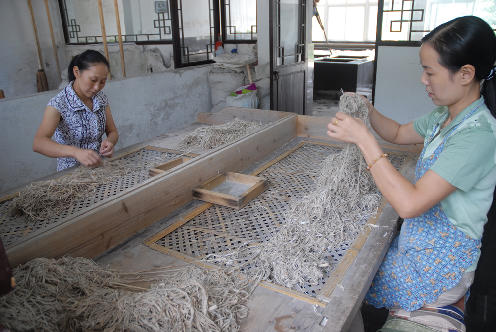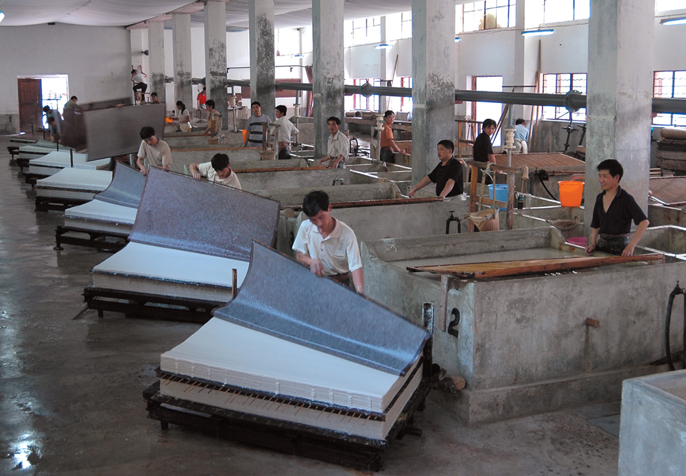 The unique water quality and mild climate of Jing County in Anhui province in eastern China are two of the key ingredients in the craft of making Xuan paper that thrives there. Handmade from the tough bark of the Tara Wing-Celtis or Blue Sandalwood tree and rice straw, Xuan paper is known for its strong, smooth surface, its ability to absorb water and moisten ink, and fold repeatedly without breaking. It has been widely used in calligraphy, painting and book printing. The traditional process passed down orally over generations and still followed today proceeds strictly by hand through more than a hundred steps such as steeping, washing, fermenting, bleaching, pulping, sunning and cutting – all of which lasts more than two years. The production of the "Paper of Ages" or "King of Papers" is a major part of the economy in Jing county, where the industry directly or indirectly employs one in nine locals and the craft is taught in local schools. True mastery of the entire complicated process is won only by a lifetime of dedicated work. Xuan paper has become synonymous with the region, where a score of artisans still keep the craft alive.
