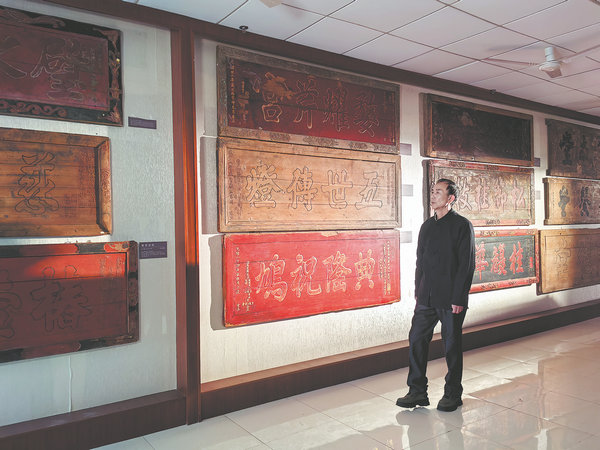 In his workshop, the air smelled of camphor wood and tung oil. Dressed in a traditional Tang (618-907)-style suit, his black-rimmed glasses perched low, Xiao was busy making new plaques for the Spring Festival holiday.