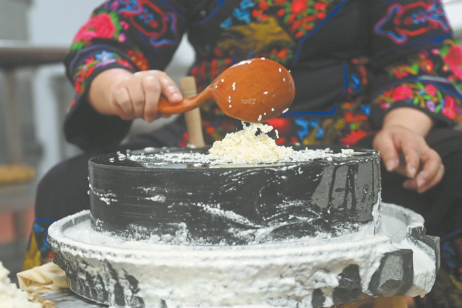 The process of making shengzha mifen involves soaking, fermenting, grinding, pressing, steaming, kneading, pounding, and final extrusion. [Photo/Xinhua]