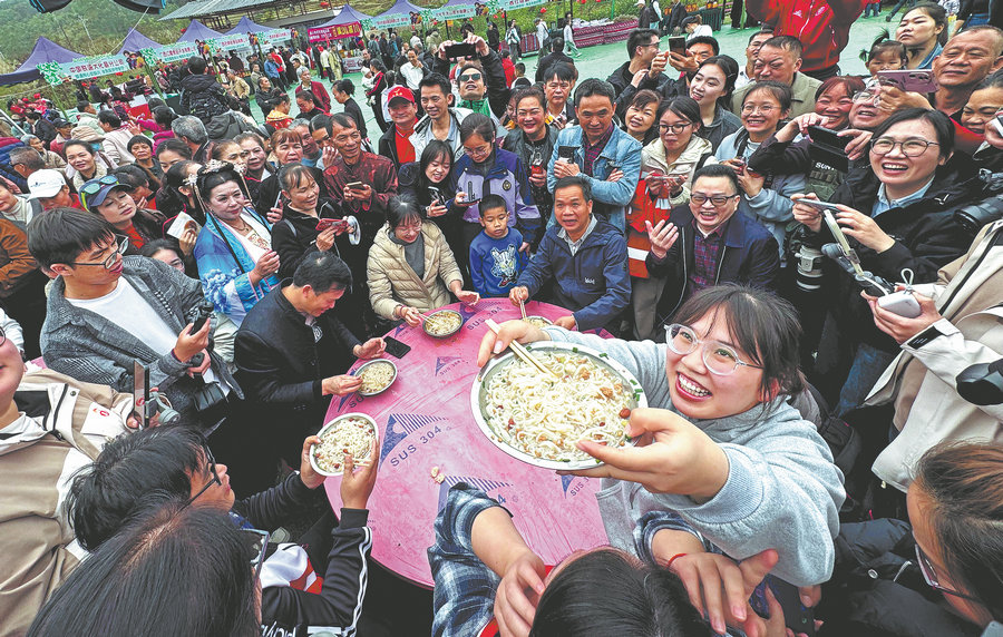The process gives the noodles a gentle sour aroma, which is both appetizing and refreshing. The production is artisanal and involves a sequence of steps: soaking, fermenting, grinding, pressing, steaming, kneading, pounding, and pressing again through a noodle press. Each step depends on experience, with temperature and humidity shaping the final result. The finished noodles are smooth, slightly springy, and deeply fragrant.
