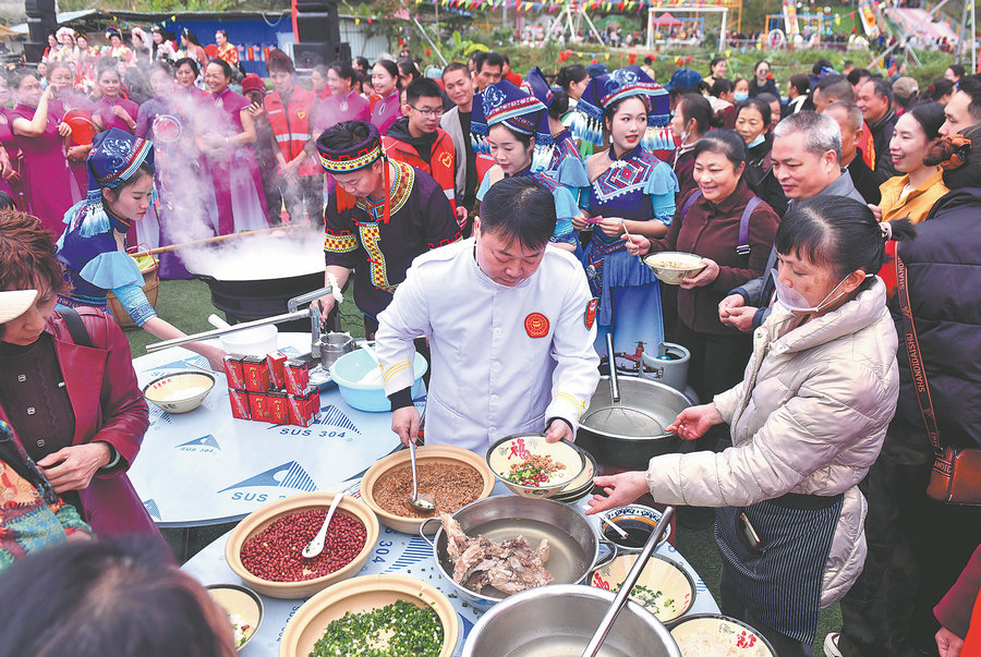 A cook tops a bowl with a generous ladle of minced pork, a sprinkle of chopped scallions and a handful of peanuts. [Photo/Xinhua]